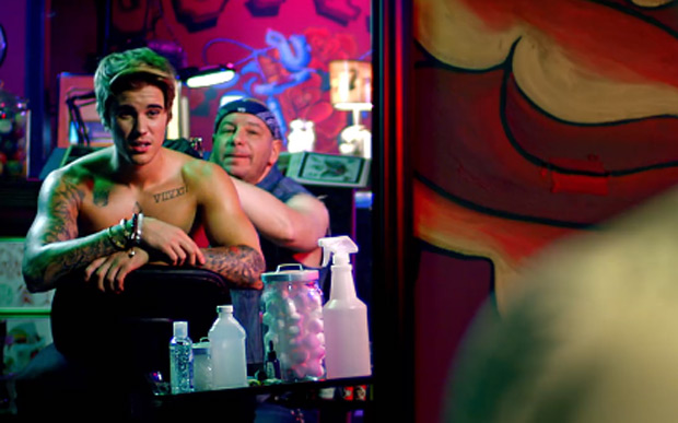 Depois de levar uma chuva de ovos, agora Justin Bieber aparece fazendo uma tatuagem bem bizarra na nova chamada do Comedy Central Roast, que vai ao ar no dia 30 de março nos Estados Unidos.